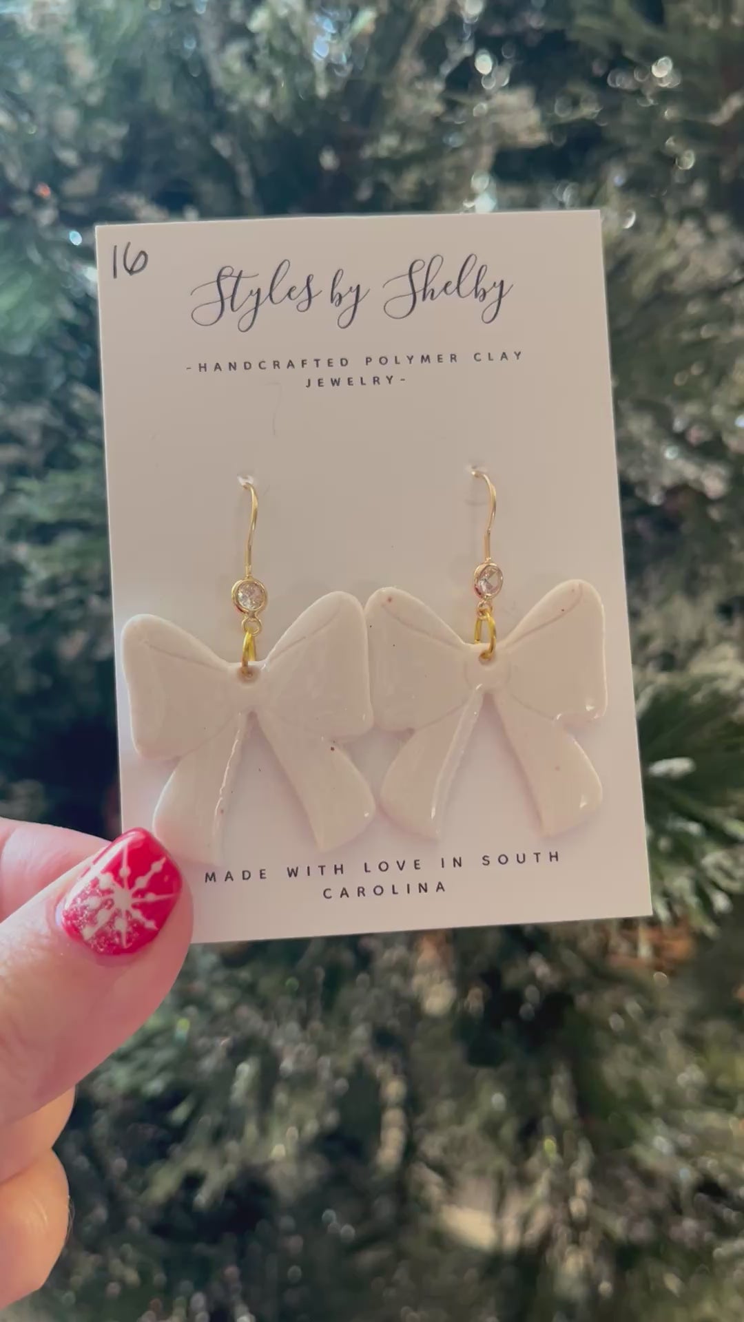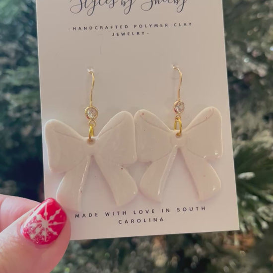 Add a little pop to your holiday outfit with these beautiful shimmery white bow clay dangle earrings.